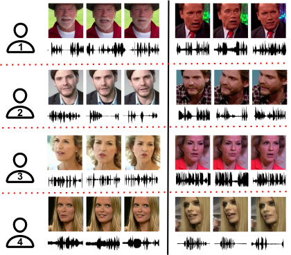 The face modality is completely missing at test time. Models must perform speaker classification using audio only, without retraining.